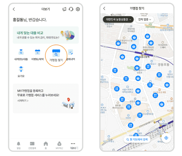 비플레이 앱에서 농할상품권을 사용할 수 있는 가맹점을 손쉽게 찾을 수 있습니다.