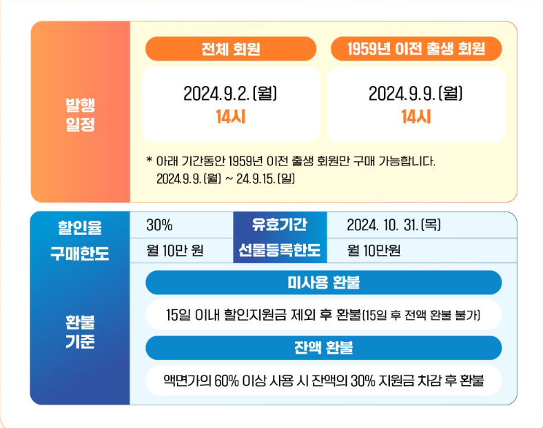 - 9월은 명절 맞이 발행으로 10만 원까지 구매 가능, 10월은 6만 원까지 구매 가능