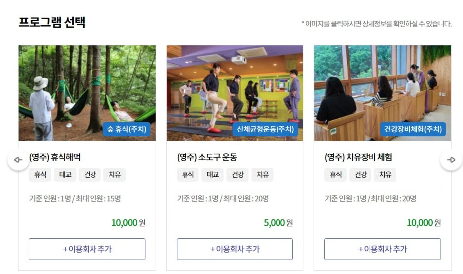 숙박 시설을 선택하고, 참여하고 싶은 체험 프로그램을 선택하세요. 예를 들어, 숲속 해먹 체험, 수치유 센터 이용, 치유 장비 체험 등 다양한 프로그램이 있어요. 원하는 날짜와 시간에 예약 가능한지를 확인하셔야 합니다.