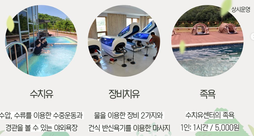 명상할 수 있는 프로그램도 있고 정말 다양하더라구요. 특히 수치유 프로그램은 근육 피로 회복과 혈액순환 촉진에 매우 효과적이며, 실내 바데풀과 건식 및 습식 사우나 이용이 포함됩니다. 치유 장비 프로그램은 음파진동 테라피기와 음파반신욕기 등을 이용하여 심신의 긴장을 풀어주는 효과가 있습니다. 이러한 프로그램들은 숲의 자연 환경과 어우러져 방문객들에게 깊은 휴식과 힐링의 시간을 제공합니다.