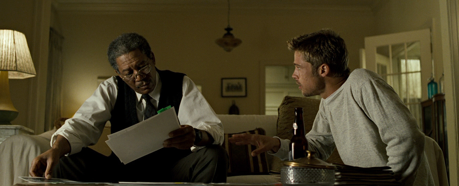 "Seven"는 브래드 피트가 연기한 데이비드 밀스 형사와 모건 프리먼이 연기한 윌리암 소메셋 형사의 이야기로 시작됩니다. 이 두 형사는 모든 사건을 통제하고 싶어하는 망상에 빠진 살인마 존 도 (케빈 스페이시 분)의 연쇄 살인 사건을 해결하기 위해 노력합니다.이들은 첫 번째 살인 사건으로서, 비판적인 성격을 가진 공직자를 기립시켜 죽인 사건을 조사하게 됩니다. 두 형사는 죽은 사람의 이름이 '그론'임을 알게 되고, 이를 통해 "7대 죄악"을 떠올리게 됩니다. 이어서 찾아온 두 번째 살인 사건에서는 '점잖음'이라는 죄악이 확인되며, 모든 살인마다 두 형사는 7대 죄악과 연결짓게 됩니다.살인마다 두 형사는 다음 죄악을 알려주는 박스를 수상하게 받게 되는데, 그 안에는 사건과 연결된 단서들이 담겨있습니다. 이런 단서들을 토대로 두 형사는 살인마다 다가오는 감시카메라의 눈을 피하며 사건을 추적합니다. 그리고 세 번째 살인 사건에서는 '탐욕'이 확인되고, 네 번째 사건에서는 '색욕', 다섯 번째 사건에서는 '게으름'이 확인됩니다.